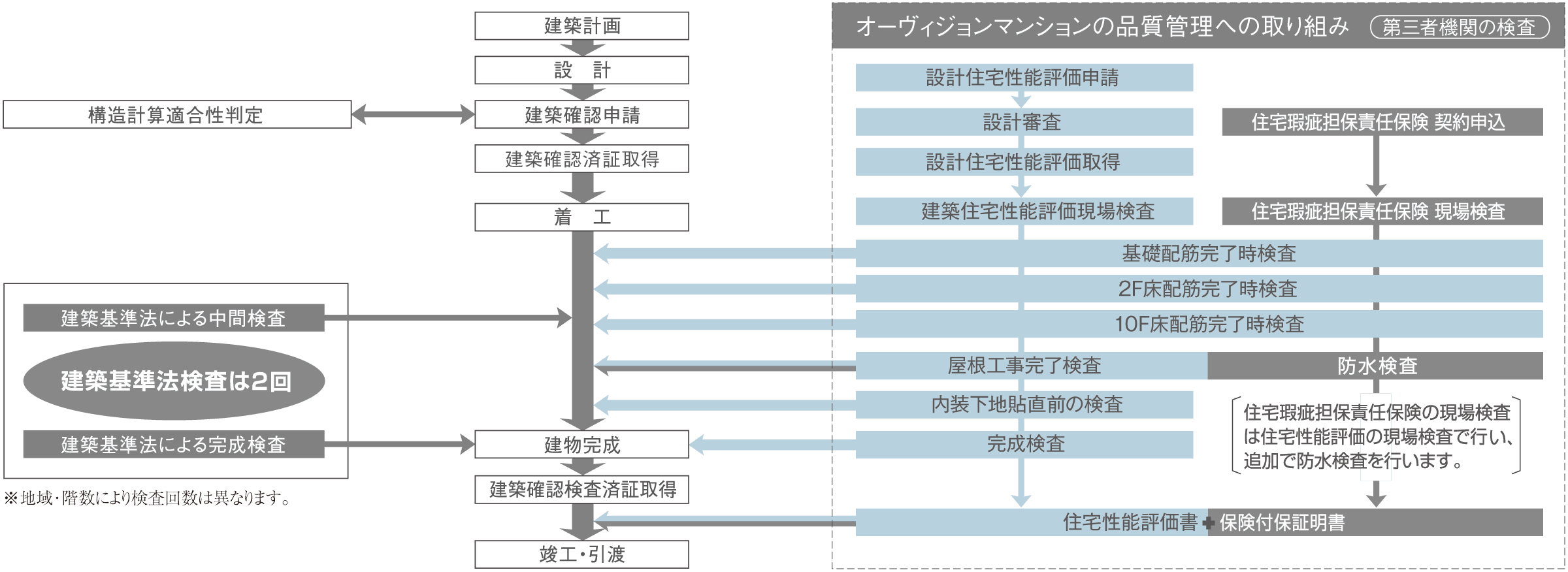 オーヴィジョンマンションでは、建築基準法による検査及び「エストラスト・設計事務所・建設会社」での検査を行い、さらに第三者機関による公平かつ厳正な検査を建築中に実施して、お客様に「安心できる住まい」をお届けします。