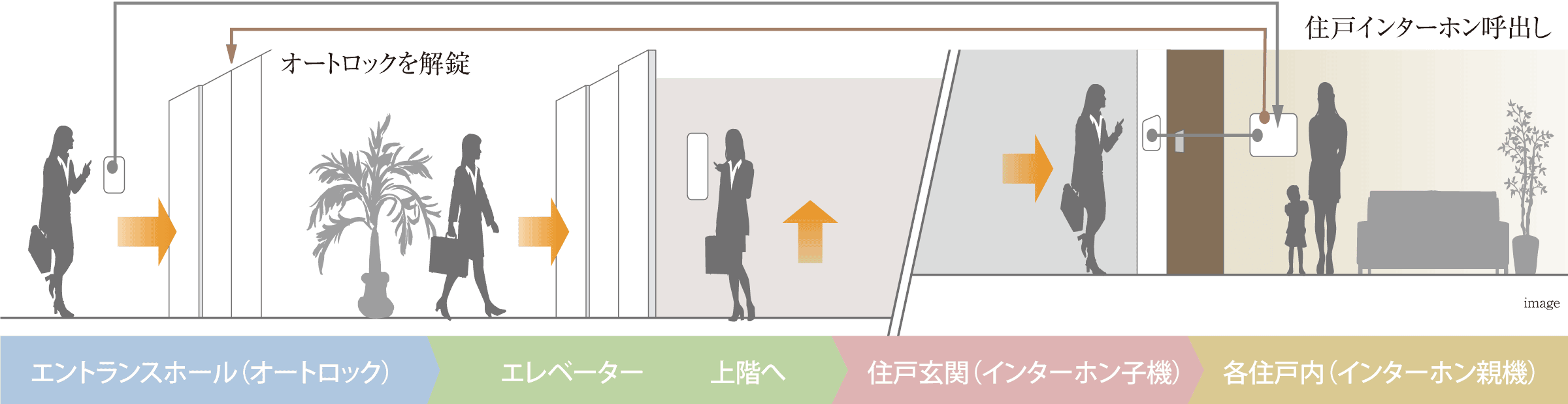 1階のオートロックが解錠すると、自動的にエレベーターが1階へ到着し、お客様をお出迎えします。