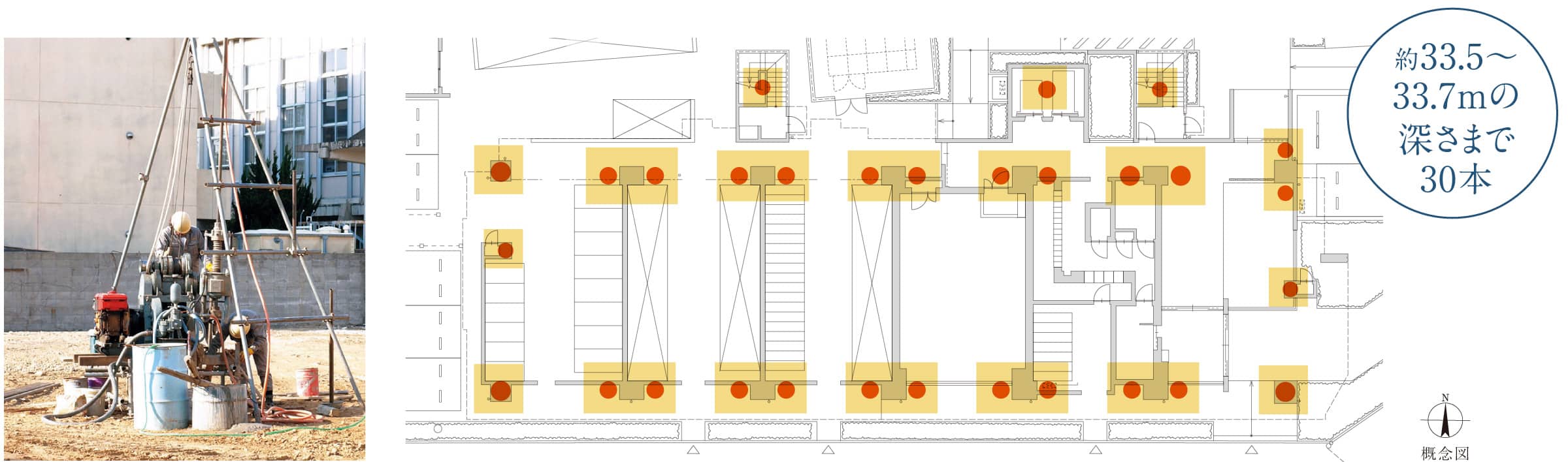 「オーヴィジョン岩国麻里布」は、地表から約33.5〜33.7mの深さまで30本の杭を打設することで建物をしっかり支えています。