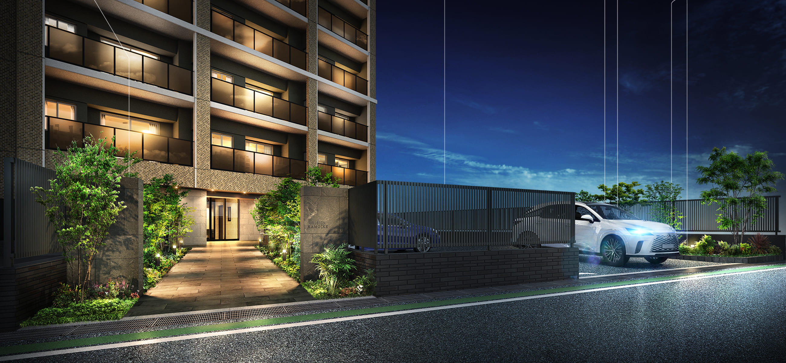 両サイドに植栽を施し、