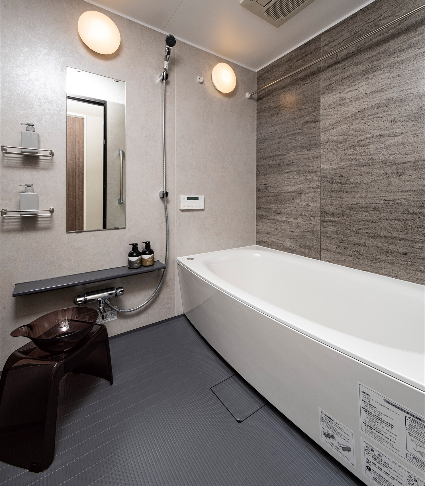 床表面の表情を工夫し、床の乾きがスピードアップ。また、お掃除しやすいように凹凸パターンの間隔を広めに設計しています。