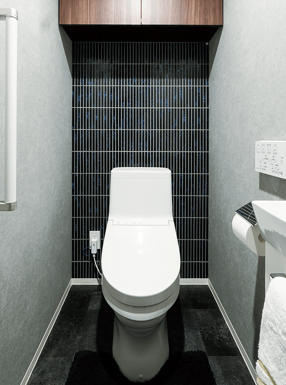 洗浄暖房便座のコードレスリモコンを壁面に設置。無理のない姿勢で操作ができます。
