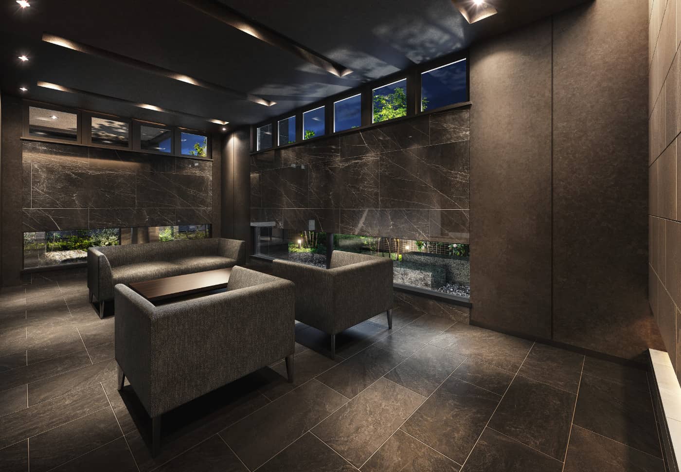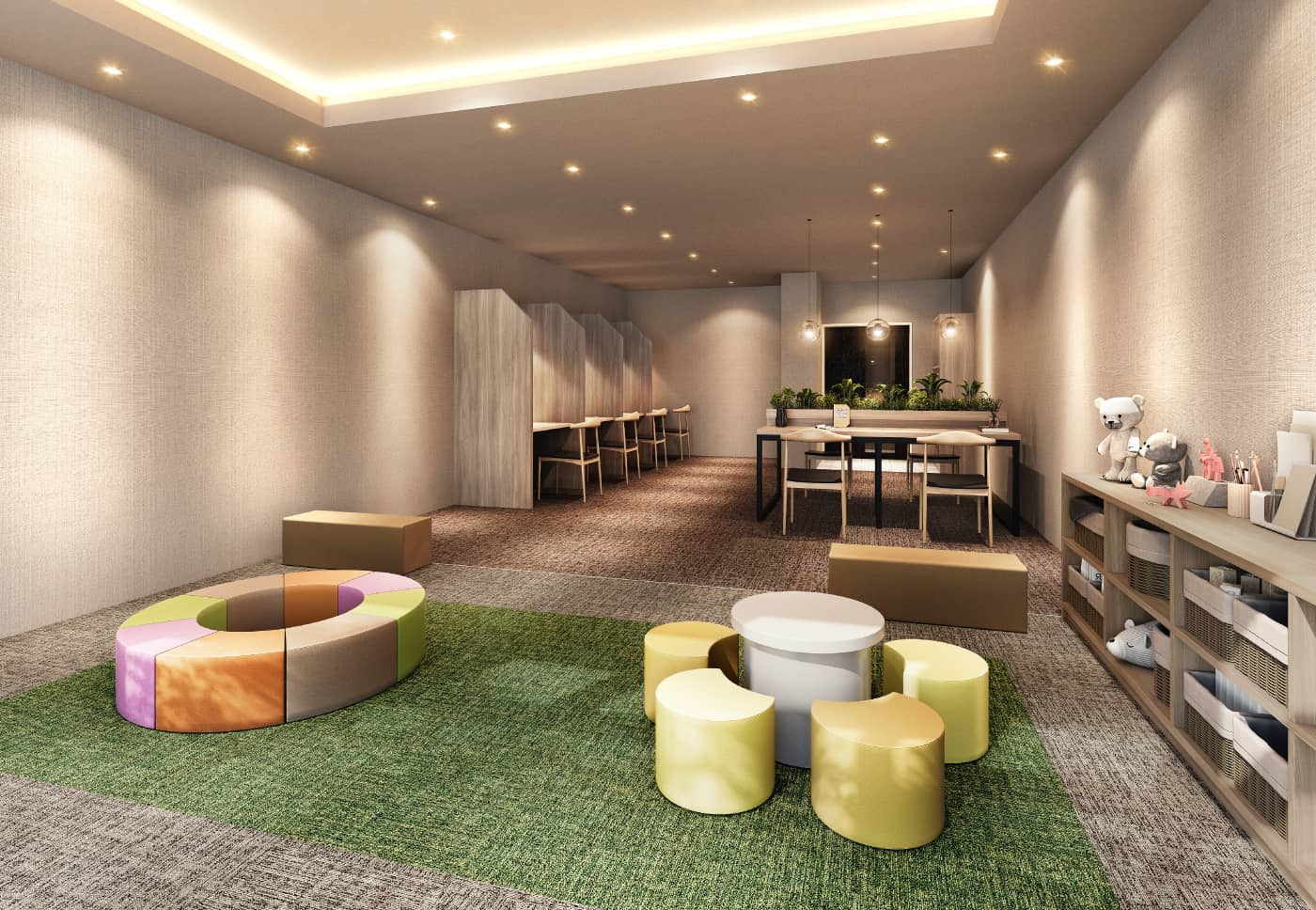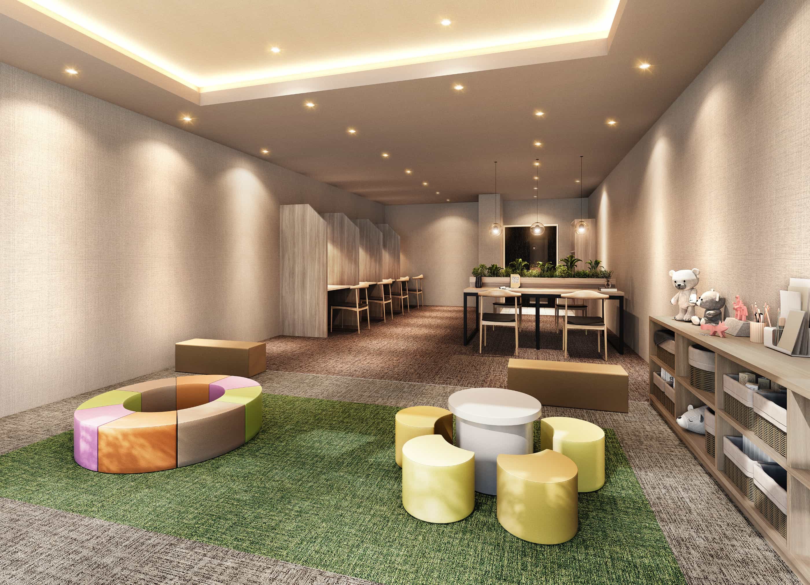 ※掲載の完成予想図は設計段階の図面を基に描き起こしたもので、実際とは多少異なる場合があります。また完成予想図で表現されている植栽は竣工から生育期間を経た状態のものを想定して描いています。竣工時は植物の育成を見込んで必要な間隔をとって植えております。
