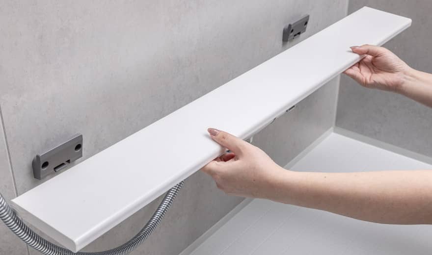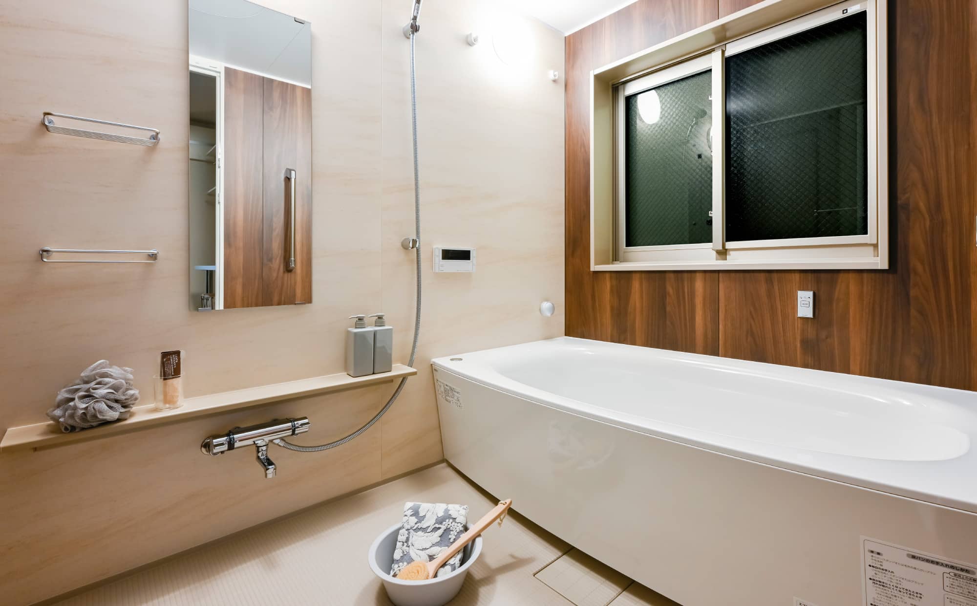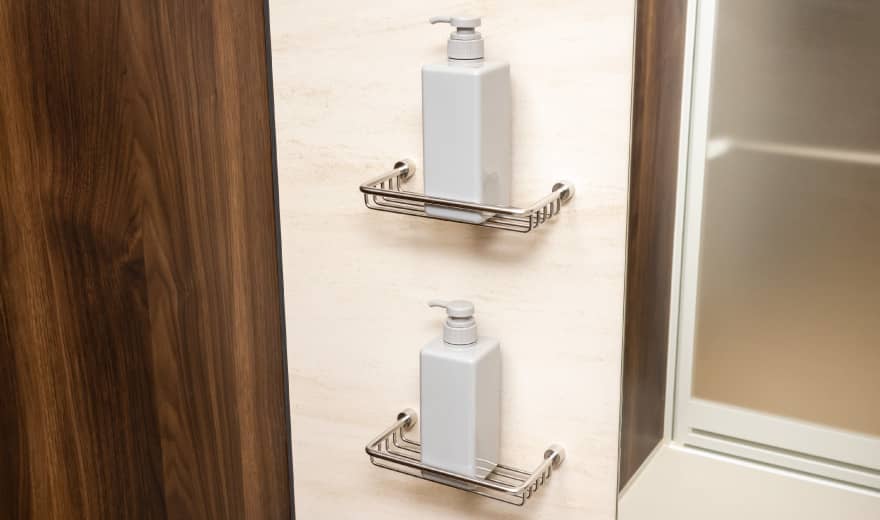- シャンプーなどのバスアイテムをすっきりと収納できる収納棚を設けました。