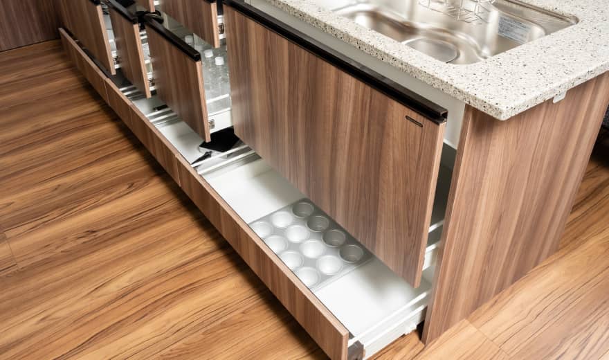 - カウンター下の収納はスライド収納となっています。 また、閉めた時の衝撃をやわらげるソフトクロージングを標準装備しました。