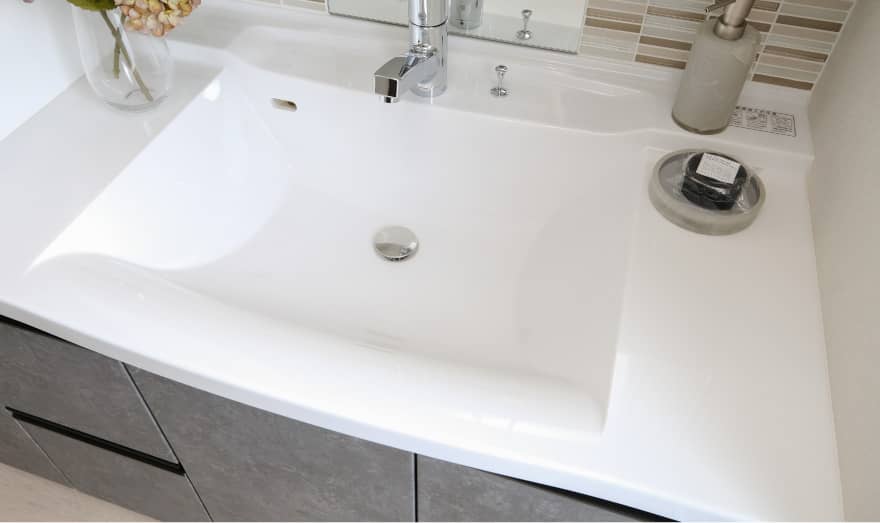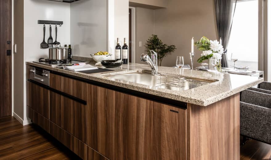 - 耐久性・防汚性に優れた、人造大理石キッチン天板です。 (食器洗浄乾燥機をお選びいただいた際は、こちらの天板となります。)