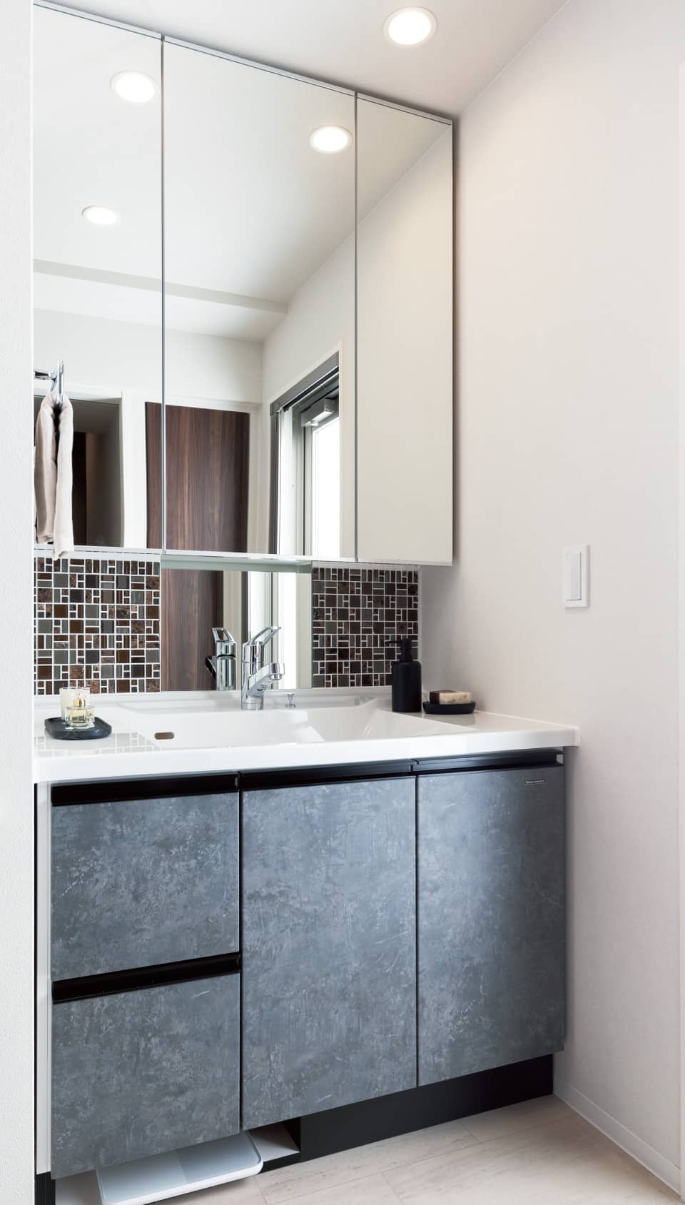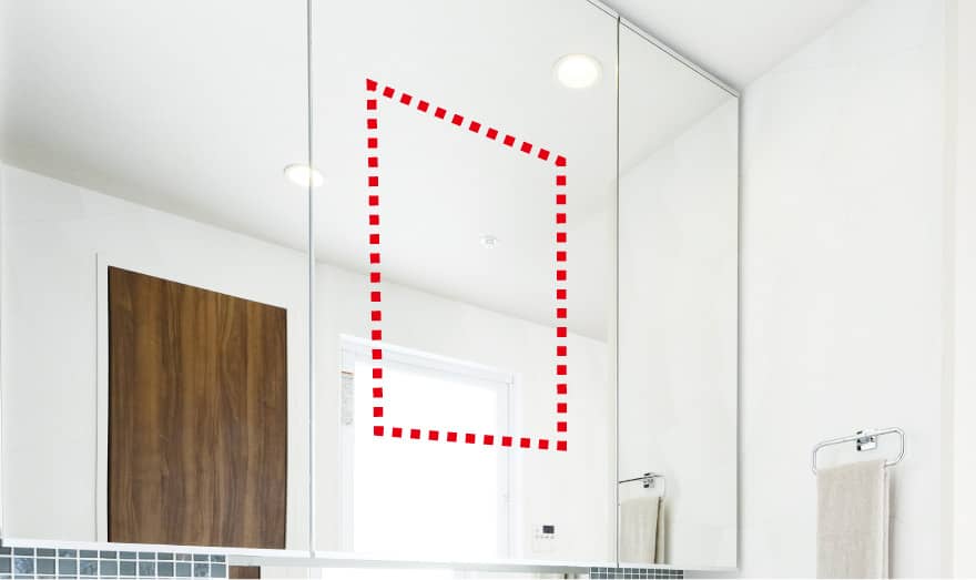- 中央の鏡はくもり止めヒーター付き。お湯を使用し、熱と湿気に包まれた時でも、スイッチを入れればスッキリくもりが取れます。