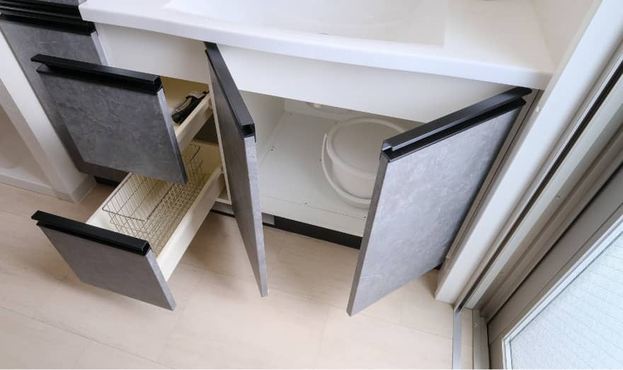 - サニタリーグッズなどを収納できるキャビネットと、洗剤や生活用品などを収納できる二段引き出しを設けました。