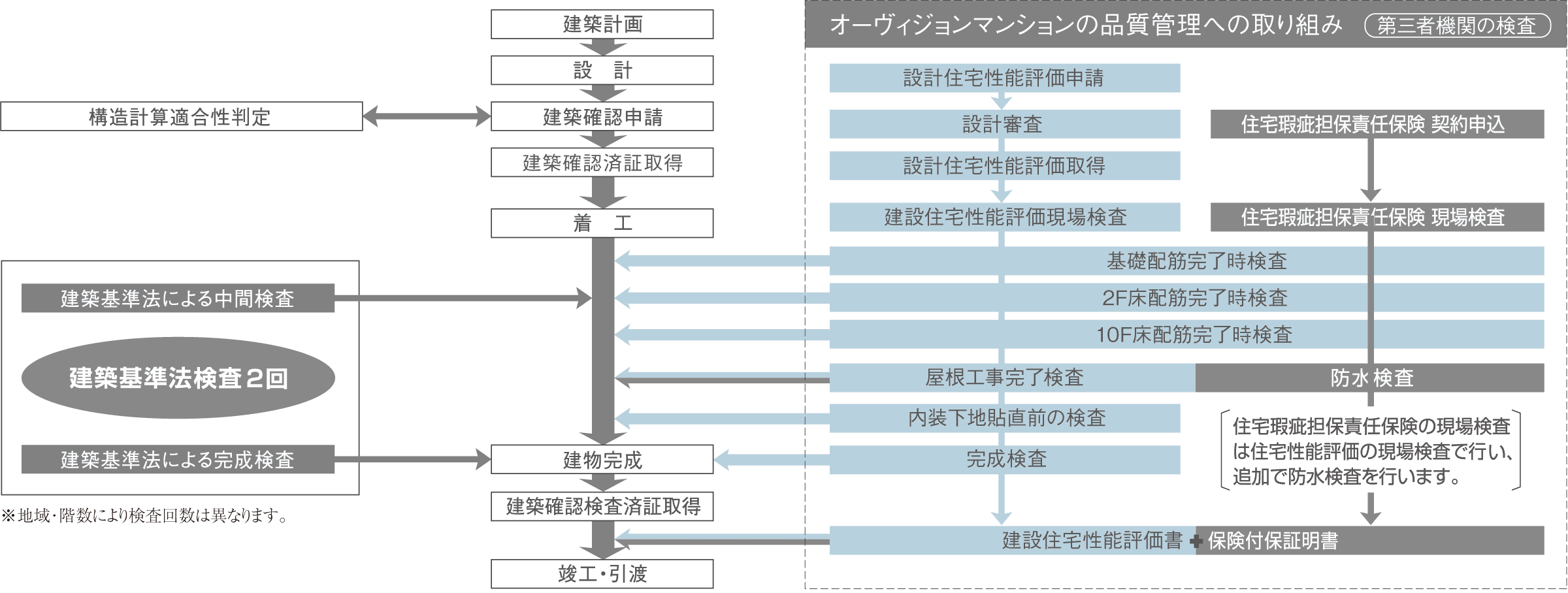 オーヴィジョンマンションでは、建築基準法による検査及び「エストラスト・設計事務所・建設会社」での検査を行い、さらに第三者機関による公平かつ厳正な検査を建築中に実施して、お客様に「安心できる住まい」をお届けします。