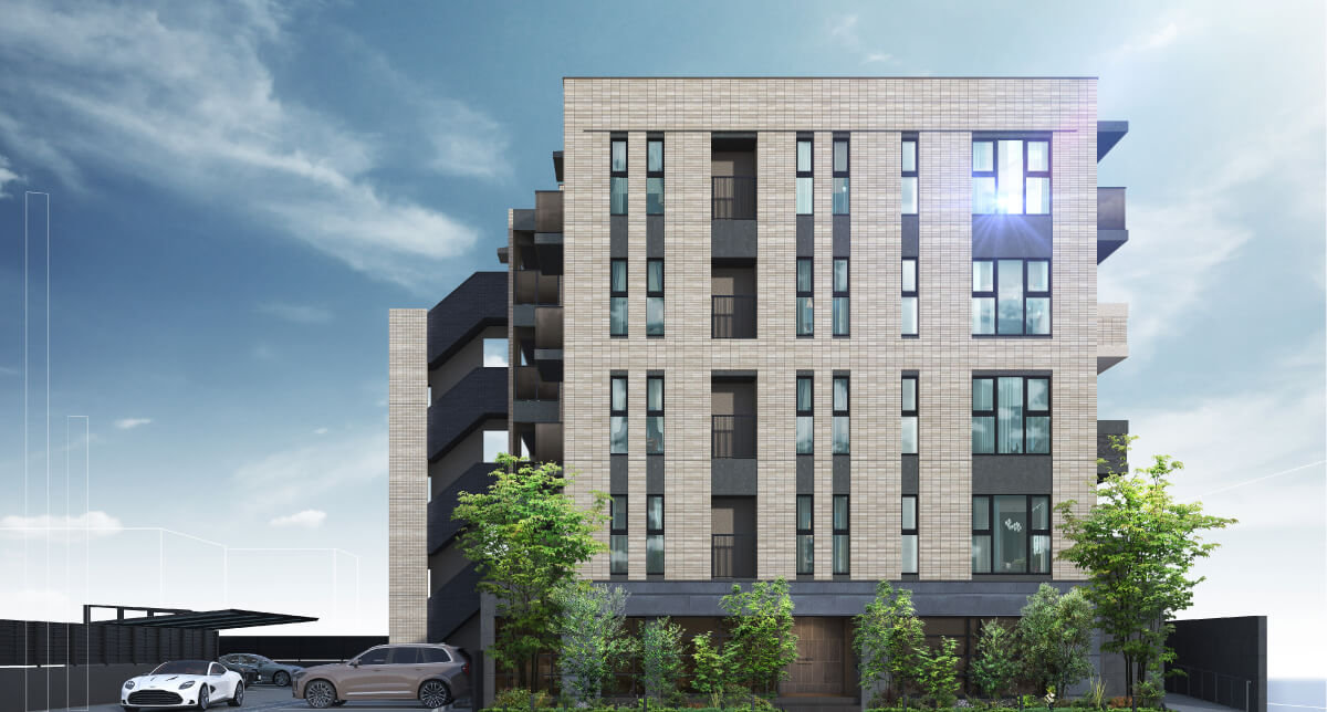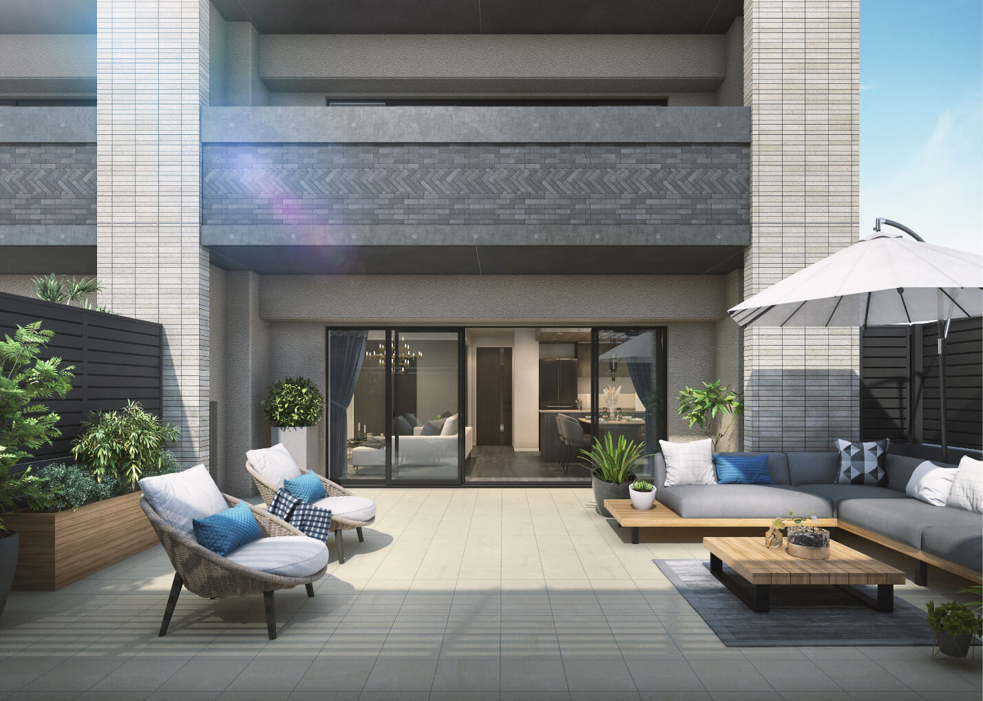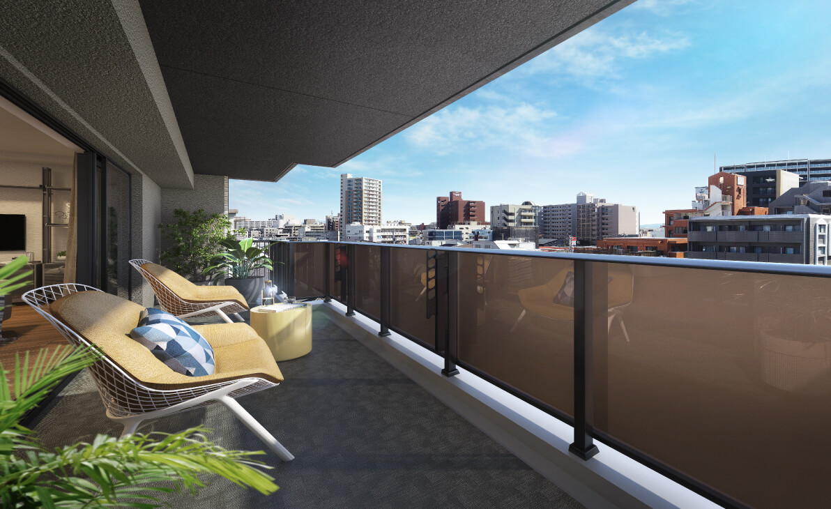 ※掲載の完成予想図は、設計段階の図面を基に描き起こしたもので、実際とは多少異なる場合があります。また、完成予想図で表現されている植栽は竣工時から初期の生育期間を経た状態のものを想定して描いております。竣工時は植物の育成を見込んで必要な間隔をとって植えております。※掲載のバルコニー眺望完成予想図は設計段階の図面を基に描き起こしたものに、5階相当の眺望写真(2025年9月撮影)を合成したもので、実際とは多少異なる場合があります。※眺望は住戸により異なります。また、将来にわたり保証されるものではありません。