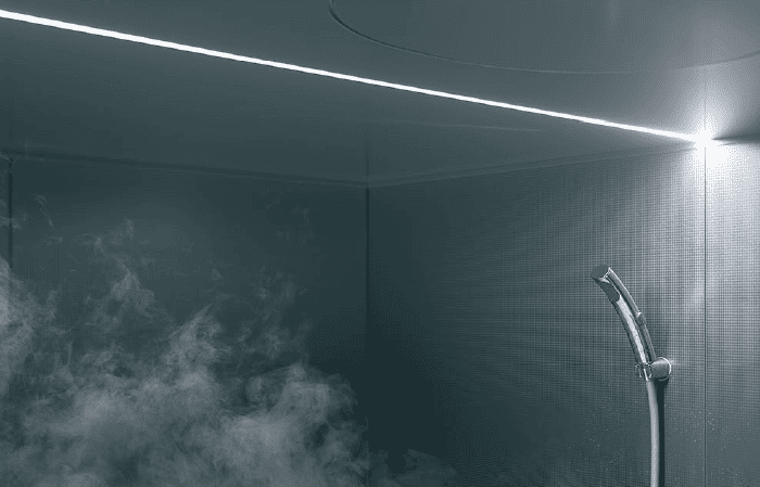- 天井にフラットに納まるライン状のLED照明。あかりの重心を意識した線状の光が、壁・天井の表情を引き立て、すっきりと美しい浴室空間を演出します。