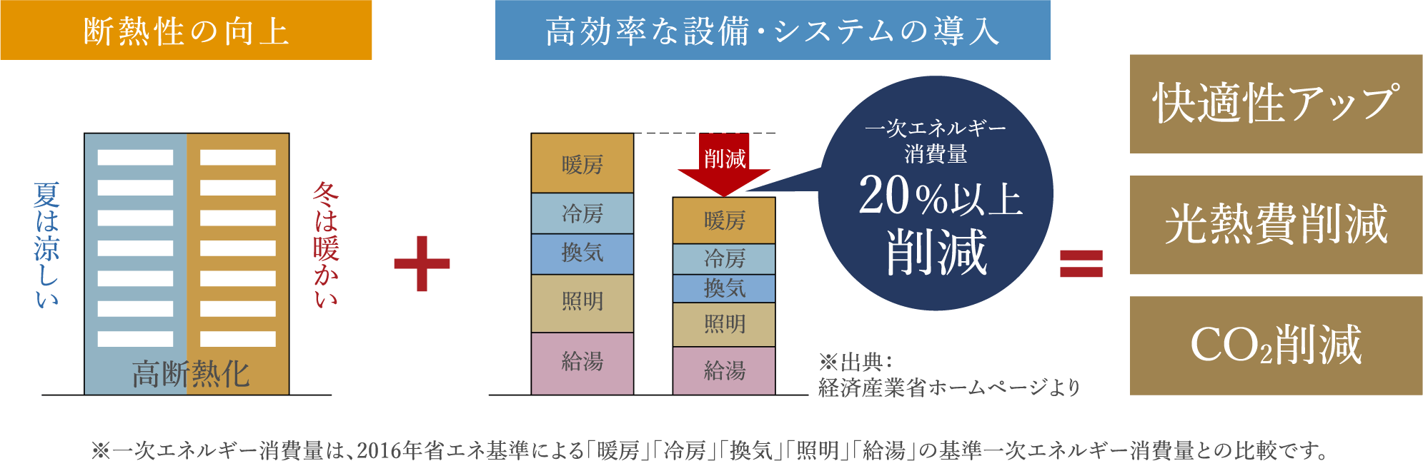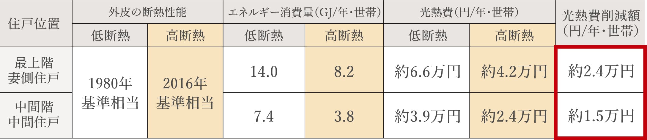 少なくし、光熱費削減に貢献。 - ZEHマンションは、一度暖めたり、冷やしたりした室内の温度が元に戻りにくいため、電気代の多くを占める冷暖房を使用する時間や設定温度をおさえることができます。低断熱仕様(1980年基準相当)から高断熱仕様(2016年基準相当)への改修を想定した試算では、冷暖房に要する光熱費を世帯あたり年間約1.5万円から約2.4万円程度節約できると推計されています。
