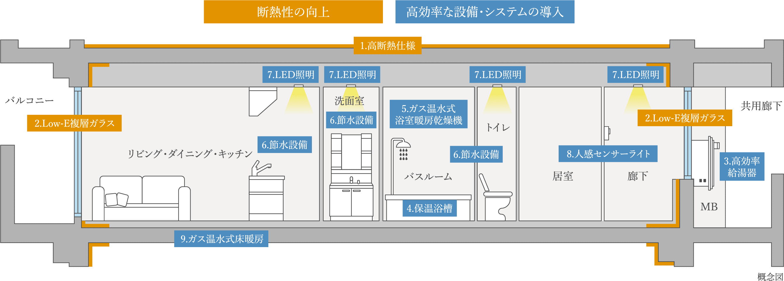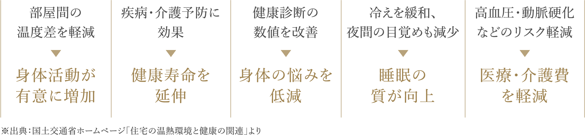 その他の健康改善効果も見込めます。 - 断熱性が低い住宅では、冬場の部屋間の移動時に急激な温度差により血圧が変動し、脳出血や脳梗塞、心筋梗塞などを引き起こすきっかけとなり、特に入浴時のヒートショック発生リスクが高まります。また、夏場にも熱中症につながる危険性が高くなります。ZEHマンションは高断熱化によるヒートショックのリスク軽減と、健康的な暮らしの実現を目指します。