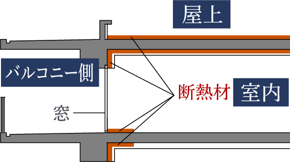 - 屋上は外側、外壁は内側から断熱材を施すことで、昼夜の温度差を小さくしてマンション全体の快適性を向上します。