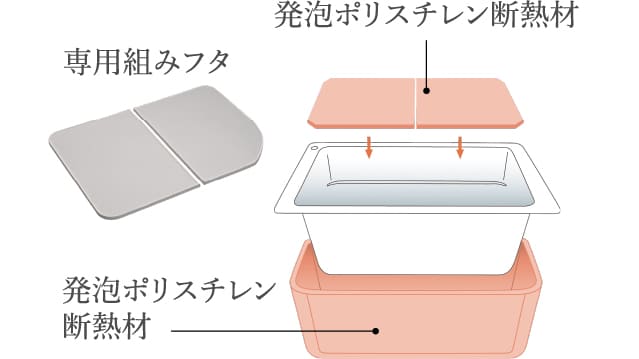 (専用組みフタ・フック付) - 専用浴槽保温材で浴槽を包み、温まった熱を逃がしません。5.5時間たっても下がる温度は約2.5℃以内です。※1