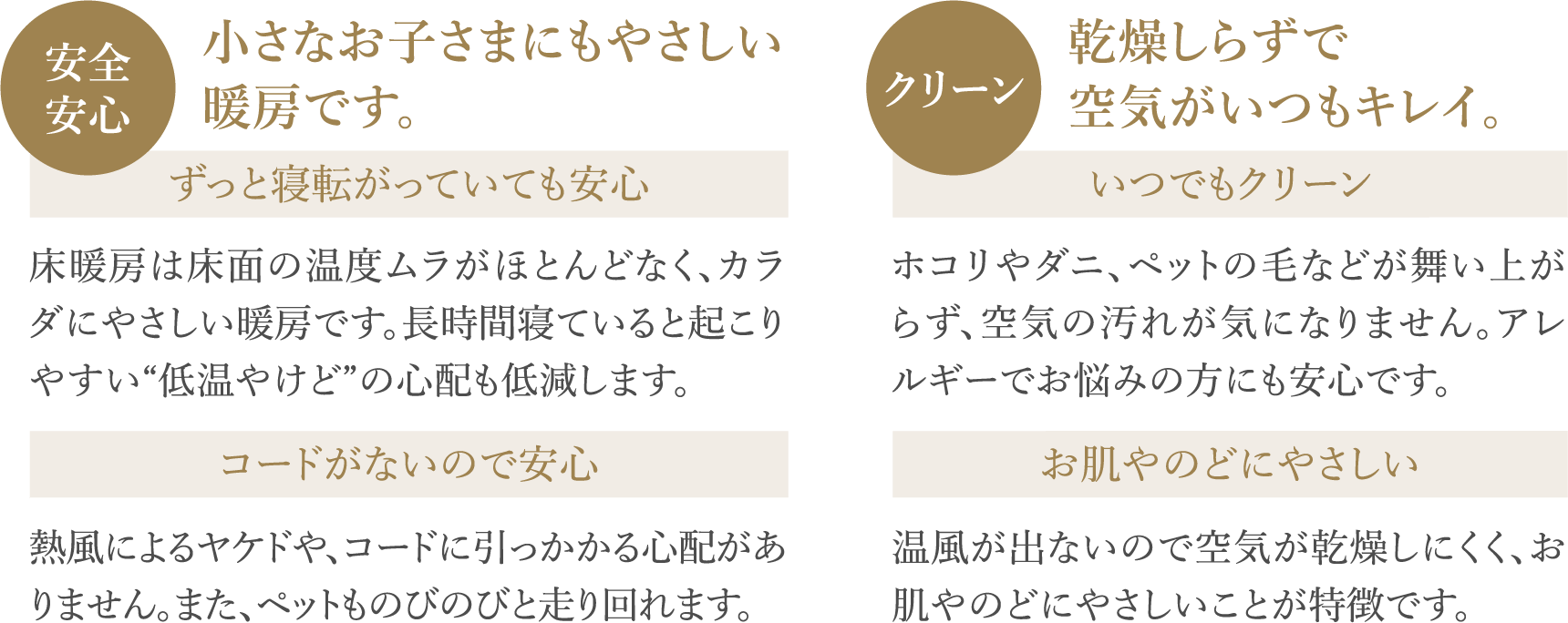 - 部屋全体の空気をやさしく暖める「ガス温水式床暖房」。給湯器で効率良くつくられたお湯が床下のパイプに送られて、部屋全体をやさしく暖めます。