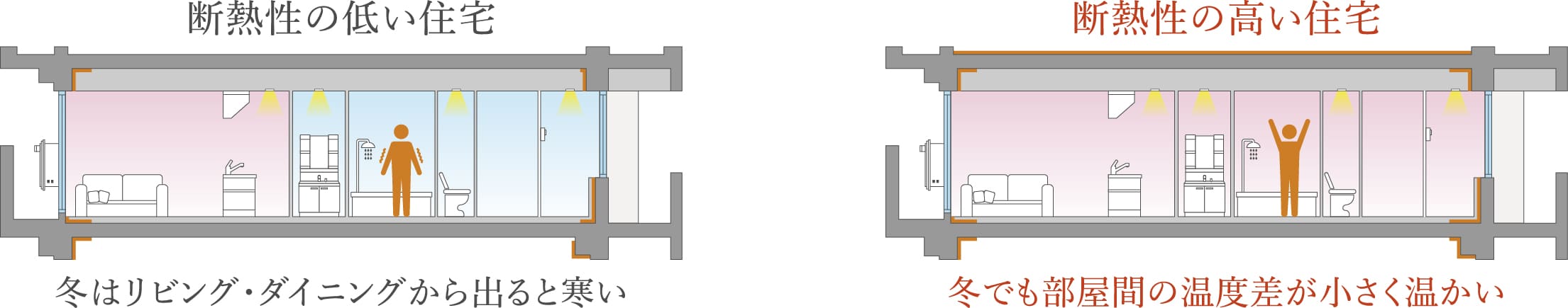 年間を通して家中が快適な空間に。 - 専有空間では、天井・床・壁・窓から熱の出入りが行われています。そのため断熱性が低い住宅だと、冬場の暖房時のリビング・ダイニングとそれ以外の部屋間の温度差が大きくなります。それに比べてZEHマンションでは、高断熱化により外気の影響を受けにくく、部屋間の温度差が小さくなり、年間を通して快適性向上に貢献します。