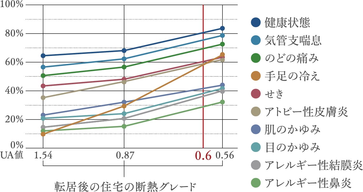 ※出典:近畿大学岩前篤教授「住宅の高断熱化による健康改善効果」のグラフは、近畿大学岩前篤教授による調査結果により作成されたもので、UA値により実際の症状が改善されることなど具体的な効果を保証するものではありません。