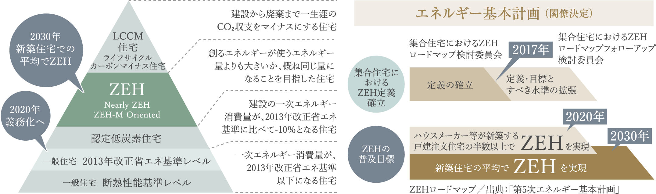 国の「エネルギー基本計画」においては、「2030年までに新築住宅の平均でZEHの実現を目指す」としています。住宅の生涯CO₂排出量を削減するLCCM住宅を最終目標に、低炭素住宅化を進めています。
