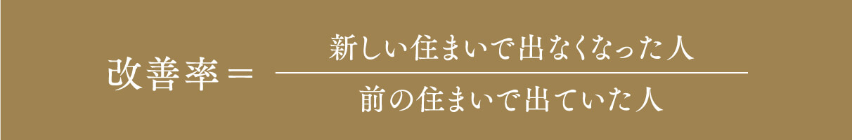 - ※出典:近畿大学岩前篤教授「住宅の高断熱化による健康改善効果」のグラフは、近畿大学岩前篤教授による調査結果により作成されたもので、UA値により実際の症状が改善されることなど具体的な効果を保証するものではありません。