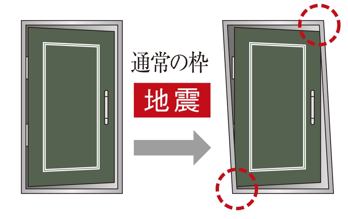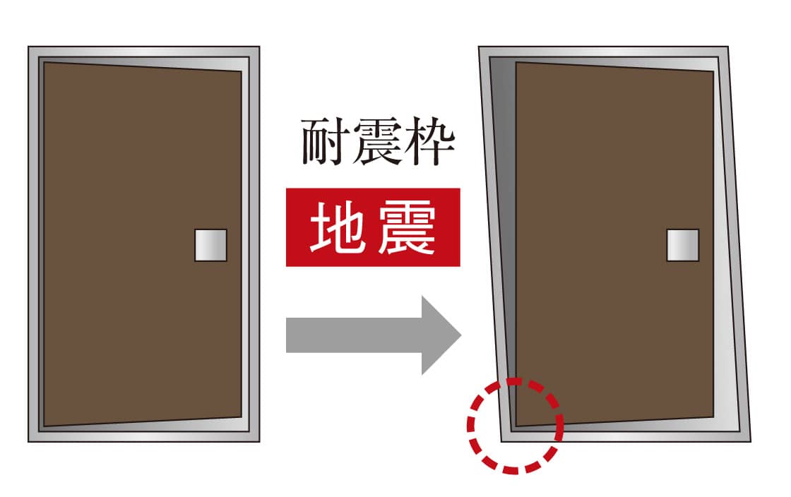 地震時に避難口が閉ざされてしまうことがないよう、玄関ドアは耐震仕様としています。ドア枠とドアとの間に適度なクリアランスを確保することで、地震により枠が変形しても、ドアが開かなくなることを防ぎます。