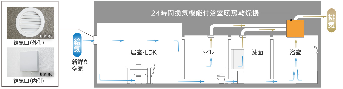 浴室の24時間換気機能付浴室暖房乾燥機により、窓を締め切った状態でも外の新鮮な空気を取り込み、室内の汚れた空気を排出する換気システムを採用しています。