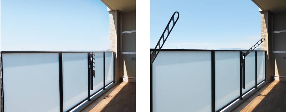 バルコニーの手摺壁に、昇降式物干金物を設置しました。未使用時は折りたたんで収納することも可能です。