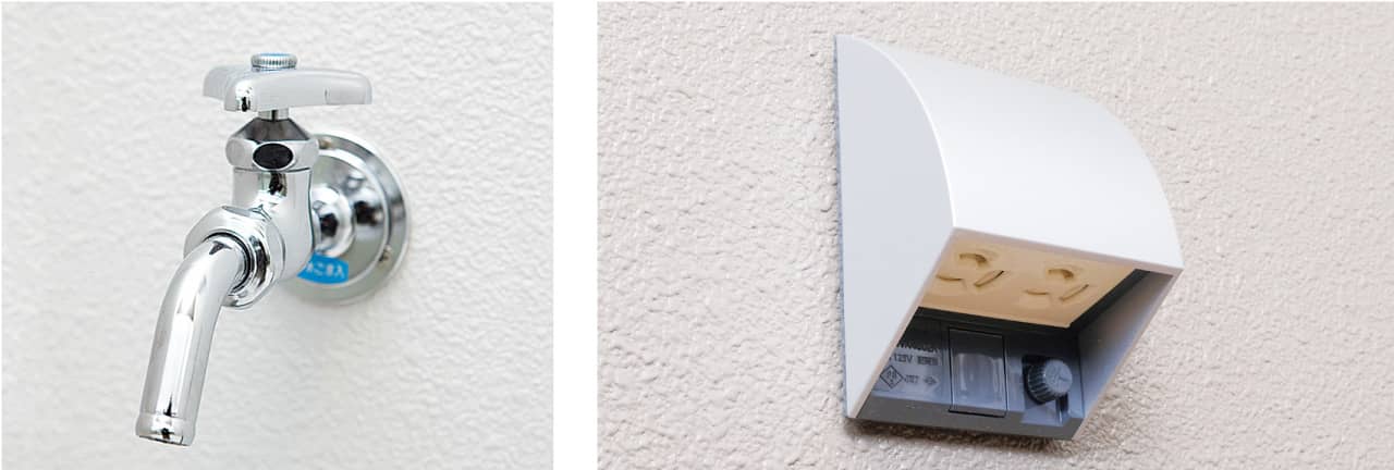 バルコニーには掃除などに便利な水栓と防水コンセントを設置しています。