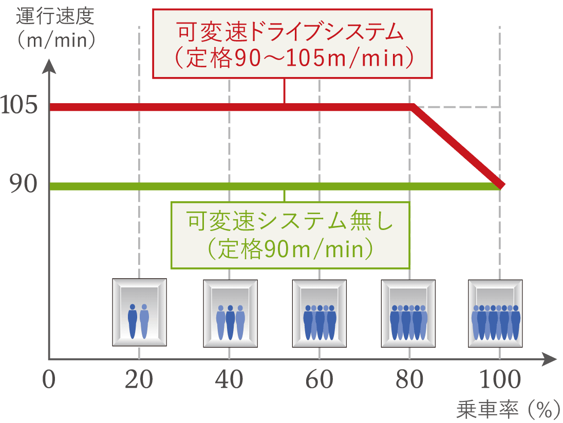 待ち時間や乗車時間を短縮することで、運転効率を向上させたエレベーターシステムを採用。かご乗車人数に応じて定格速度以上で走行させることができ、乗車時間・待ち時間が今までよりも短縮されます。
