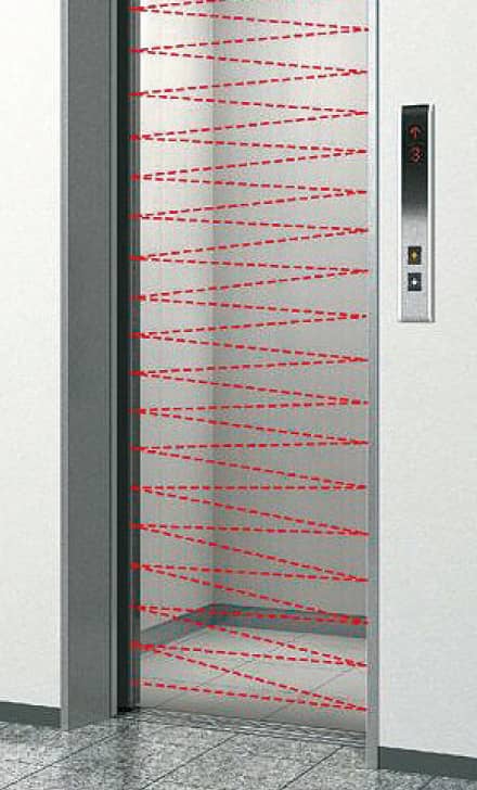 カゴ内の戸袋付近を赤外線で監視し、カゴ内の戸袋に近付く乗客の手や小荷物などを感知して、ドアの開く速度を減速します。また、ドアが閉まる際、高性能赤外線マルチビームドアセンサが危険を感知し、人や荷物の挟まりを防止します。