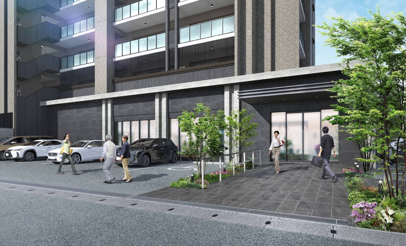 ※掲載の完成予想図は設計段階の図面を基に描き起こしたもので、実際とは多少異なる場合があります。また完成予想図で表現されている植栽は竣工から生育期間を経た状態のものを想定して描いています。竣工時は植物の育成を見込んで必要な間隔をとって植えております。