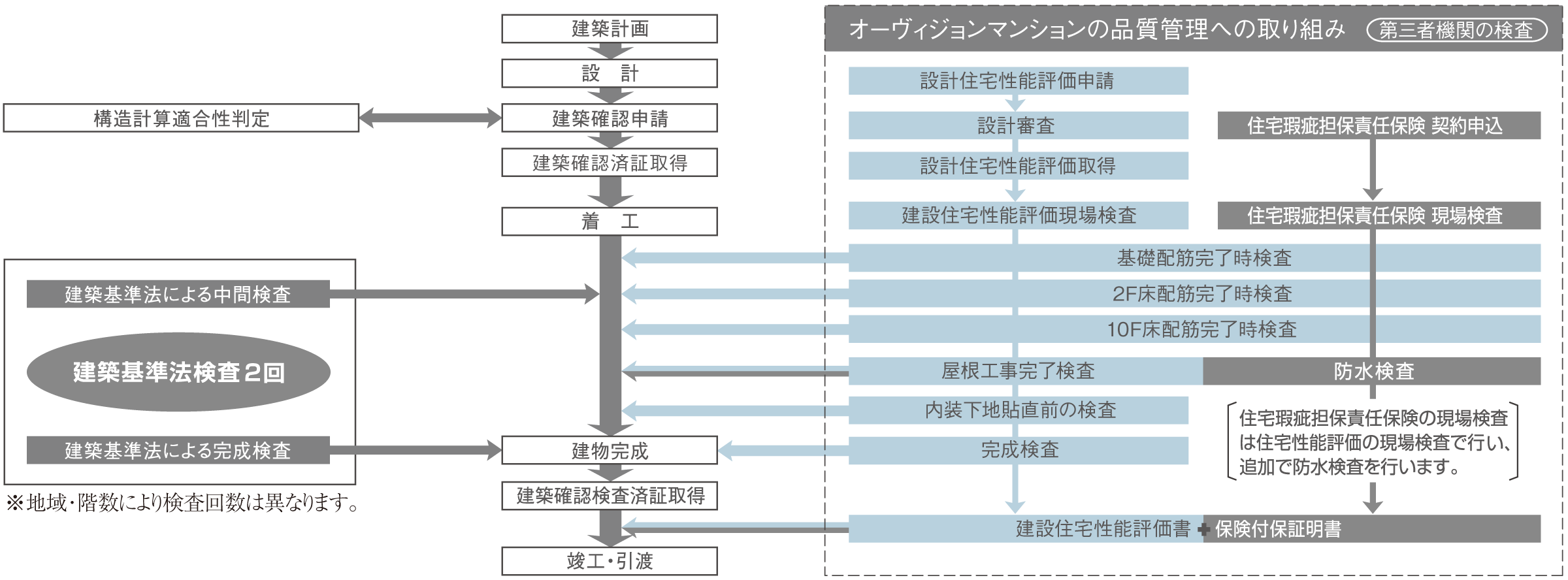 オーヴィジョンマンションでは、建築基準法による検査及び「エストラスト・設計事務所・建設会社」での検査を行い、さらに第三者機関による公平かつ厳正な検査を建築中に実施して、お客様に「安心できる住まい」をお届けします。