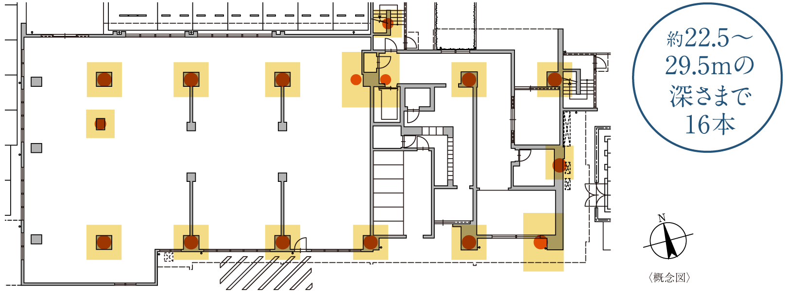 「オーヴィジョン新南陽駅前Ⅱ」は、地表から約22.5〜29.5mの深さまで16本の杭を打設することで建物をしっかり支えています。