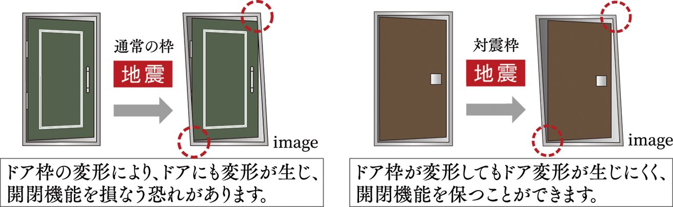 地震時に避難口が閉ざされてしまうことがないよう、玄関ドアは対震仕様としています。ドア枠とドアとの間に適度なクリアランスを確保することで、地震により枠が変形しても、ドアが開かなくなることを防ぎます。 -