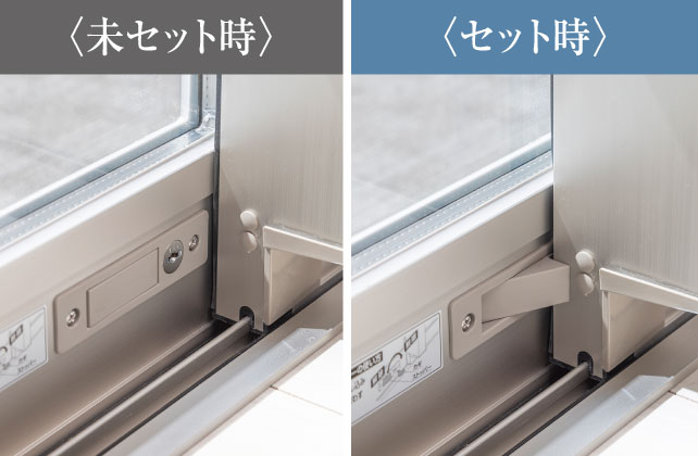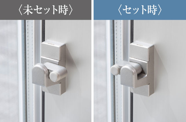 引き違い窓には回転ストッパーを設け、サッシ引き違い時に指を挟む事故を防ぎます。