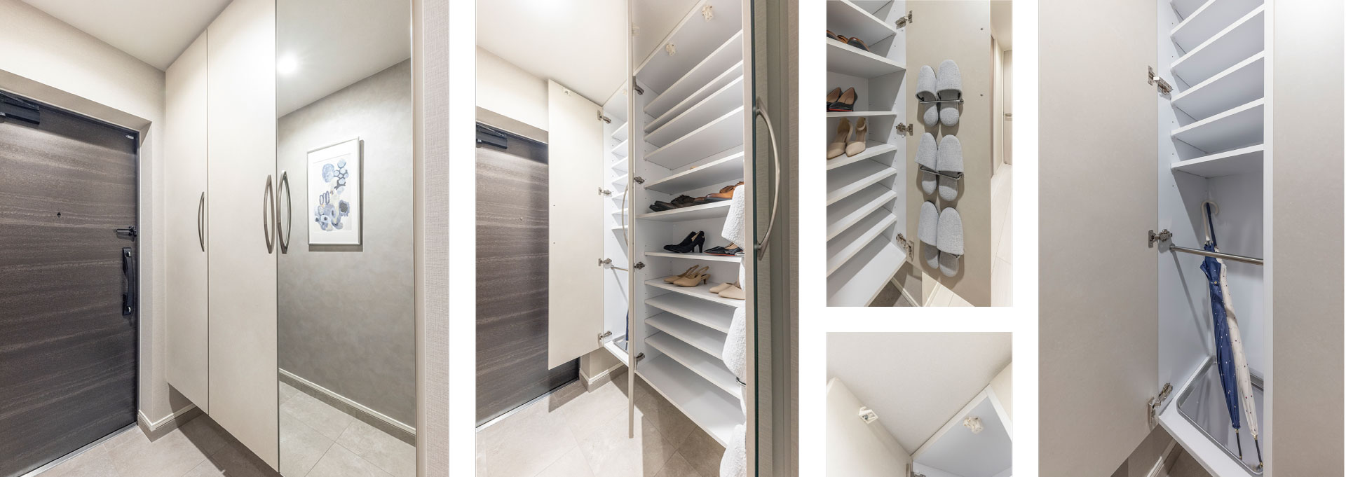 玄関にはトールタイプの鏡付きシューズボックスを設置しました。扉の内部にはスリッパ収納や傘立てを設けています。また、耐震ロックを装備しているので、地震で揺れるとフックが作動し、開こうとする扉をロックします。