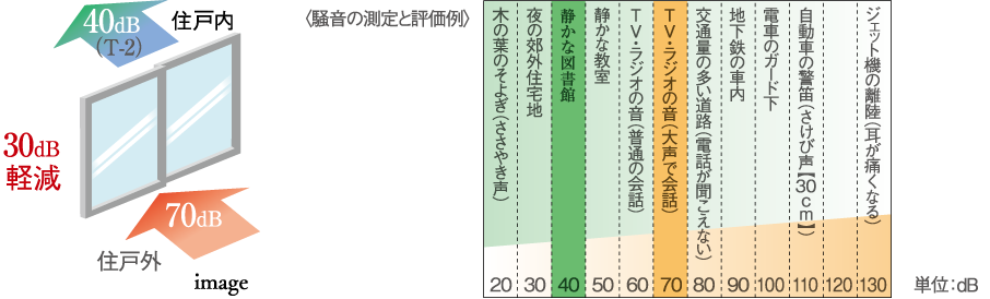 防音サッシ(T-2)を採用しています。- ※数値はサッシの性能値であり、実際の騒音環境とは異なります。