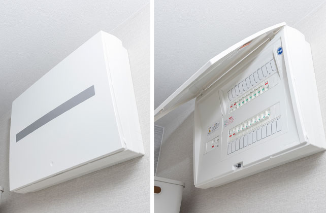 分電盤は、コード短絡保護用瞬時遮断機能付で、コード短絡時の通過エネルギーを抑え、事故の拡大を防ぎます。 -