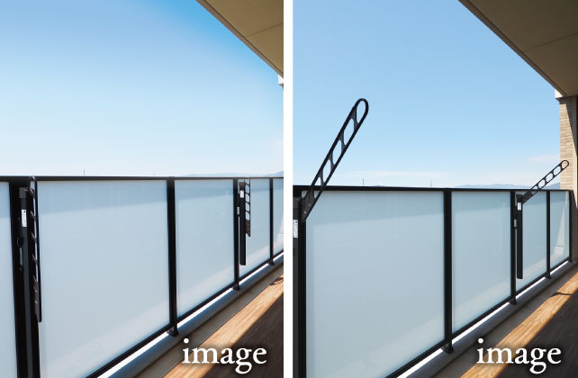 バルコニーの手摺壁に、昇降式物干金物を設置しました。未使用時は折りたたんで収納することも可能です。 -