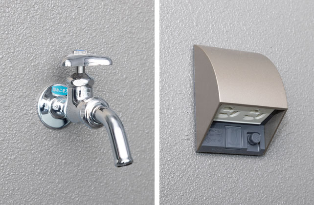 バルコニーには掃除などに便利な水栓と防水コンセントを設置しています。 -