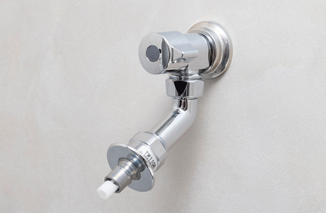万一通水中にホースが外れても瞬時に止水する緊急止水機能付の洗濯用水栓です。