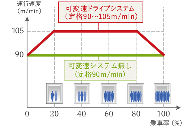 ドライブシステム待ち時間や乗車時間を短縮することで、運転効率を向上させたエレベーターシステムを採用。かご乗車人数に応じて定格速度以上で走行させることができ、乗車時間・待ち時間が今までよりも短縮されます。 -