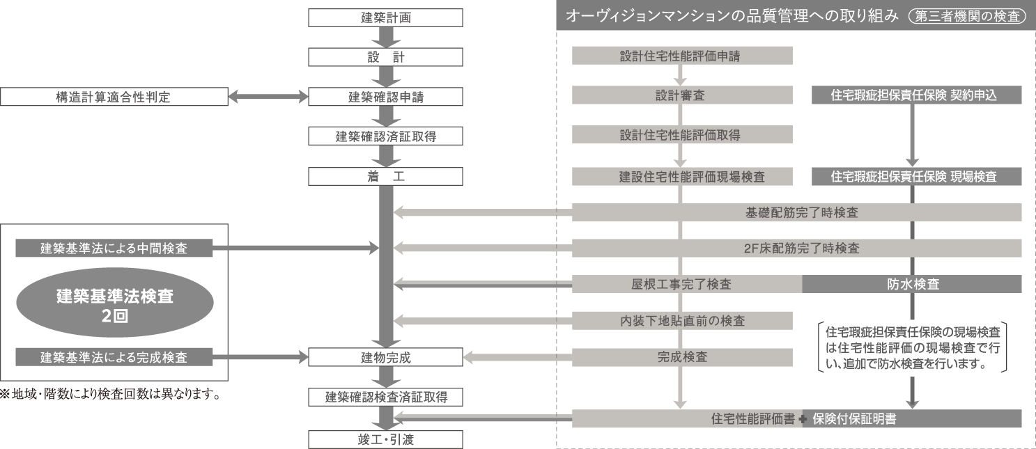 オーヴィジョンマンションでは、建築基準法による検査及び「エス トラスト・設計事務所・建設会社」での検査を行い、さらに第三者機関による公平かつ厳正な検査を建築中に実施して、お客様に「安心できる住まい」をお届けします。