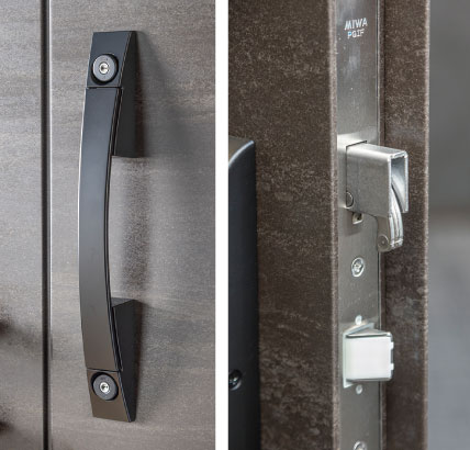 玄関ドアには、鍵穴をハンドルの上下2ヵ所に設け、防犯性を高めました。またデッドボルトと呼ばれる部分をバールなどを使った暴力破壊行為に対しても高い防犯性能を示す、鎌デッド方式としております。