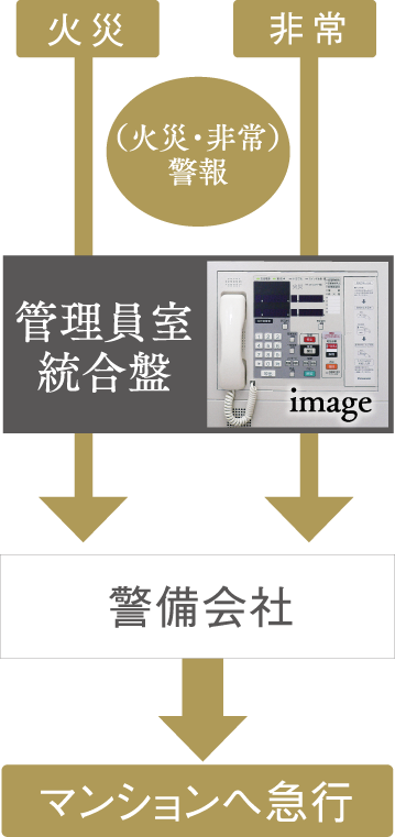 火災が起こった場合、エレベーターを1階へ直行で着床させ、一時エレベーターの運転を休止して二次災害を防ぎます。