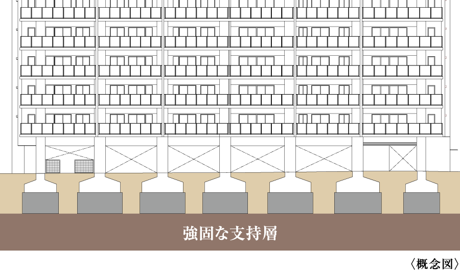 オーヴィジョンマンションでは、標準貰入試験などの地盤調査を事前に行い、建物に対し最も適切な基礎方式を選定しています。また、「オーヴィジョン新下関プレステージ」では、地表から比較的近い位置に支持地盤がある場合に用いられる直接基礎工法を採用しております。