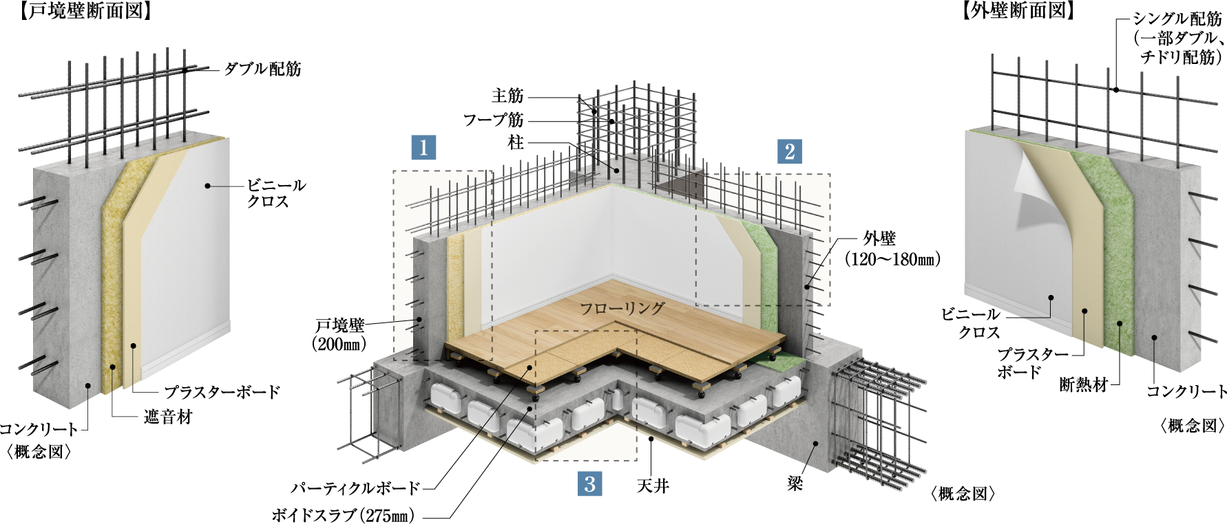 外壁のコンクリート厚を120〜180mmとし、さらに住戸内側から断熱材を施し、断熱性に配慮しています。
