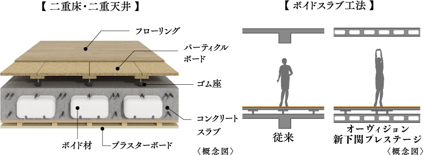 床と天井は、将来のメンテナンスやリフォーム等にも対応できるよう、二重構造としています。また、部屋の中の小梁をできるかぎりなくし、すっきりとした空間づくりを実現する為に、ボイドスラブ工法を採用しています。
