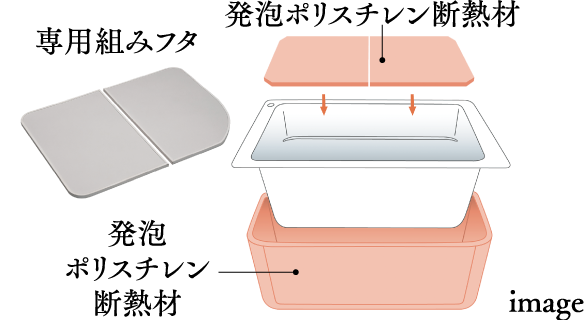 専用浴槽保温材で浴槽を包み、温まった熱を逃がしません。5.5時間たっても下がる温度は約2.5℃以内です※1。