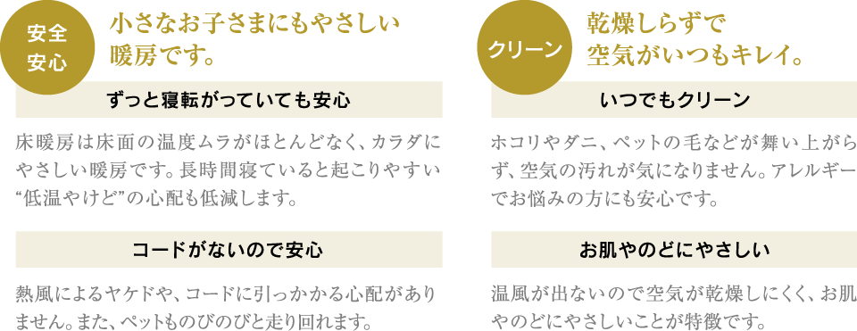 部屋全体の空気をやさしく暖める「ガス温水式床暖房」。給湯器で効率良くつくられたお湯が床下のパイプに送られて、部屋全体をやさしく暖めます。